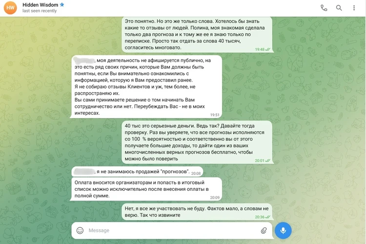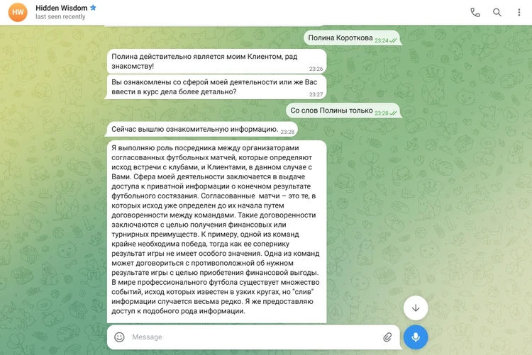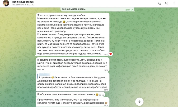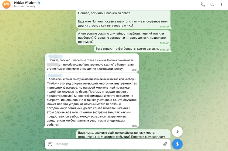 Роль аккаунта с именем Полина тоже ясна. Как только я начал задавать Владимиру много вопросов, с аккаунта Полины посыпались сообщения о том, что «уже есть прогноз» и «когда я буду его покупать?». Торопит изо всех сил.