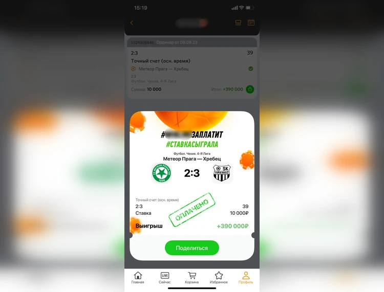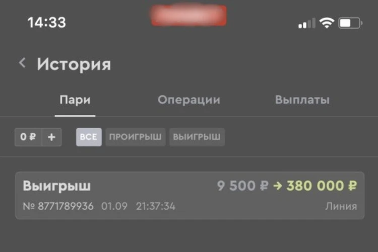 Через несколько дней Полина шлет второй скриншот. И тоже с ошибкой. Это я заметил сразу, так как данным букмекерским приложением пользуюсь сам. Выигрыши в нем никогда не обозначаются в виде отдельного окошка. Хотя… и 300 тыс. рублей я тоже «не выигрывал».